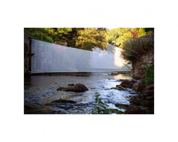 Original photograph of sculpture by Eco-Artist John K Melvin.  Aven Project was a temporary site specific sculpture installation of 29 translucent panels installed along nearly 2km of river in rural France in the town of Pont Aven.  Pont Aven is home to many artists.  This particular photograph shows two panels installed at the beginning of the Xavier Grall Promenade in Centre Ville, a section of L’Aven river open to the public and very popular with tourists.